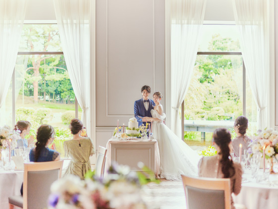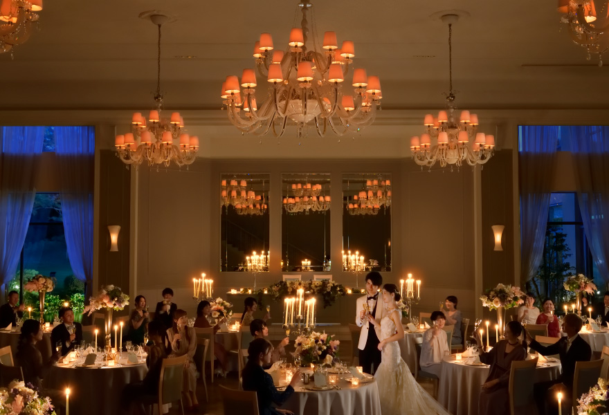 シャンデリアの優美な光、匠の技が冴えるウッドフロア。庭園に面した窓から見える絵画のような花々。すべて本物でしつらえた最上級の舞台をご用意しました。