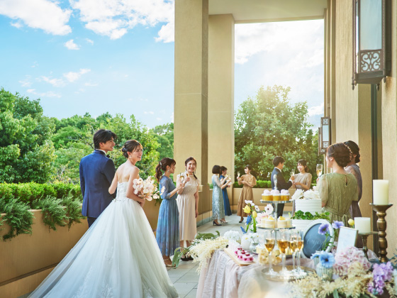 お招きしたゲストを最初におもてなしするのは、眼下に広がる息をのむような庭園の眺めと、ようこその気持ちを満たしたウエルカムドリンク。